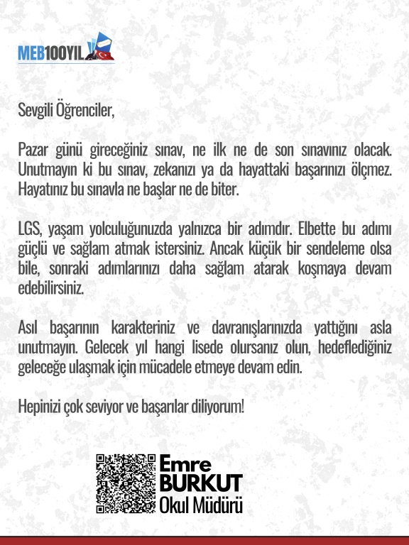 Asıl başarının karakteriniz ve davranışlarınızda yattığını asla unutmayın. Gelecek yıl hangi lisede olursanız olun, hedeflediğiniz geleceğe ulaşmak için mücadele etmeye devam edin.